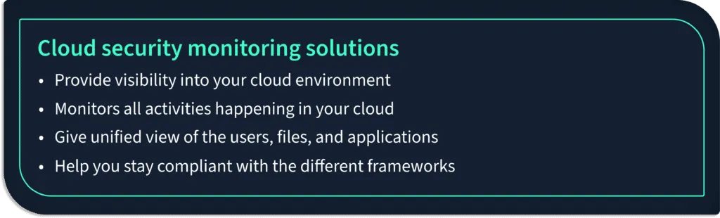 - A cloud monitoring solution monitors all activities happening in your cloud infrastructure. It continuously looks for risky activities and helps mitigate the threat in real time.