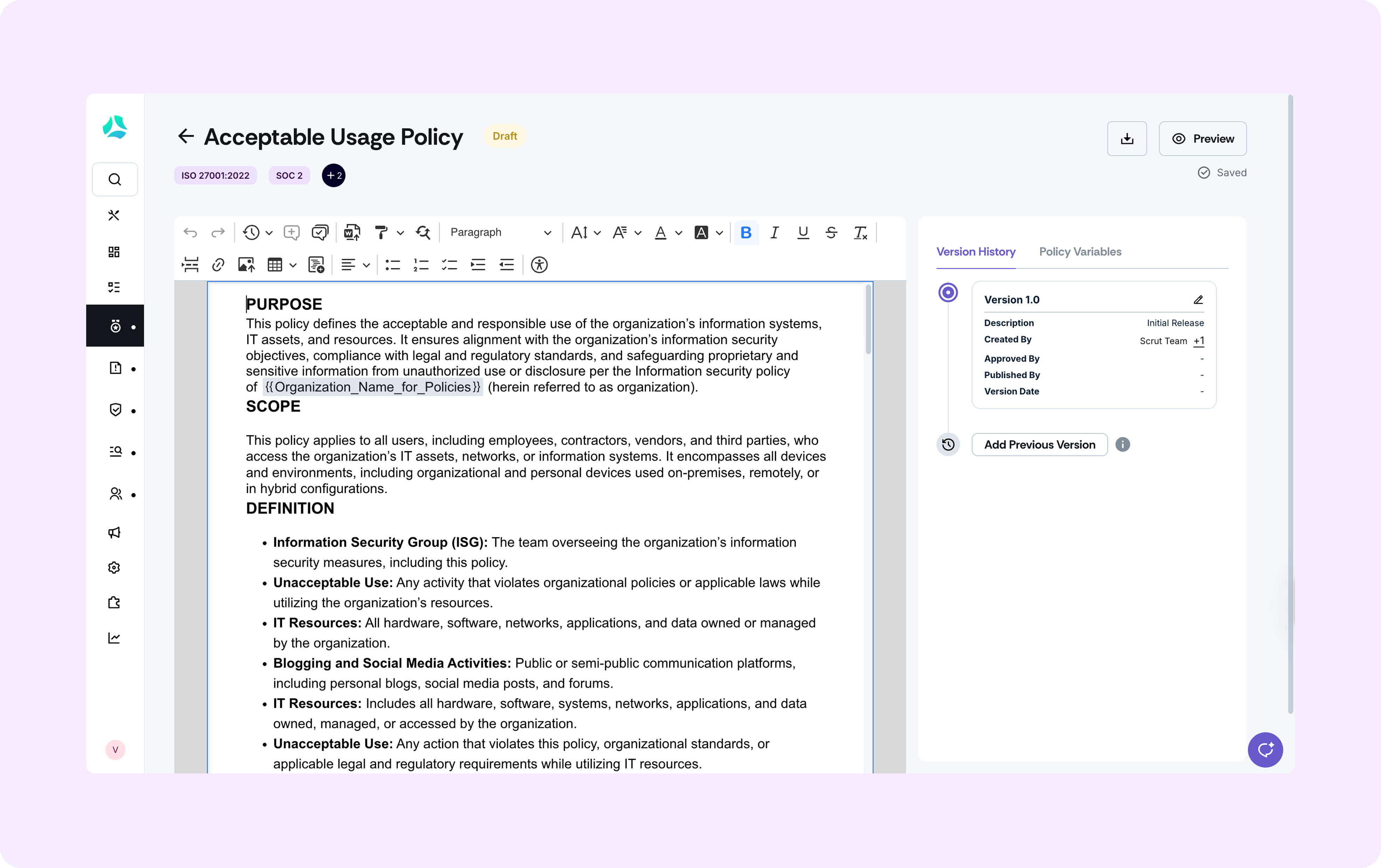 With no prior certifications and no existing compliance documentation, Pluto Security used Scrut's library of auditor-vetted, customizable policy templates to establish their baseline from day one. Rather than drafting policies from scratch, Gil worked from templates already aligned to SOC 2 and ISO 27001 requirements, customized them to Pluto Security's environment using the built-in editor, and had a working, audit-ready policy set in place early in the process.