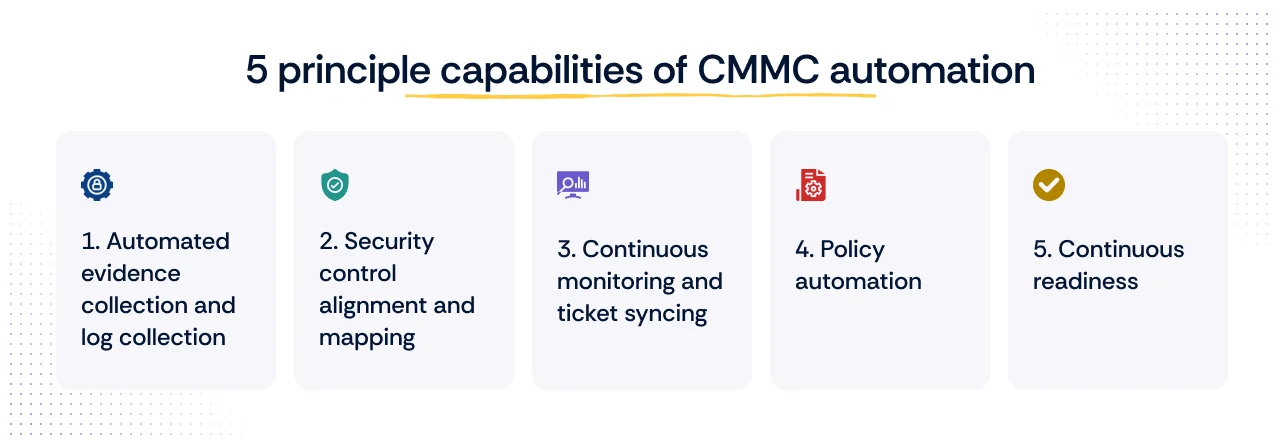 It is crucial to differentiate genuine CMMC automation from "semi-manual tool usage." True automation involves zero-touch data handling: the platform integrates, collects, maps, flags, and initiates remediation autonomously.