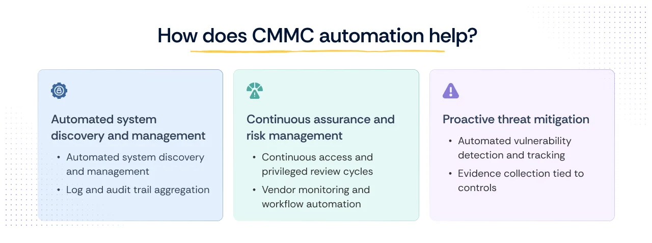 Compliance with CMMC requires a precise understanding of the scope, including every system that processes, stores, or transmits CUI. Automation addresses this foundational need through two functions: