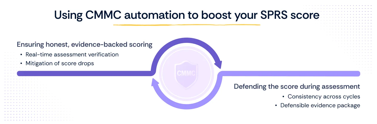 The SPRS scoring system, which tracks the required NIST SP 800-171 self-assessment score, serves as a mission-critical indicator of a contractor’s compliance status for the DoD. A reliable, defensible score is paramount for both contract eligibility and maintaining the integrity of the cyber posture. CMMC automation directly strengthens this score by ensuring its accuracy, consistency, and defendability.