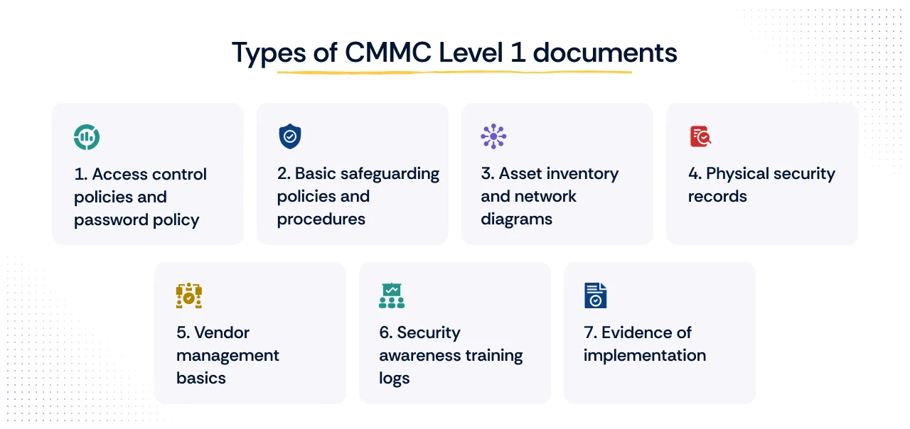 This blog breaks down all the essential CMMC documents you need, from policies and procedures to SSPs, POA&Ms, and evidence packages, so you can stay organized, compliant, and fully prepared for CMMC Level 1 or Level 2 assessments.