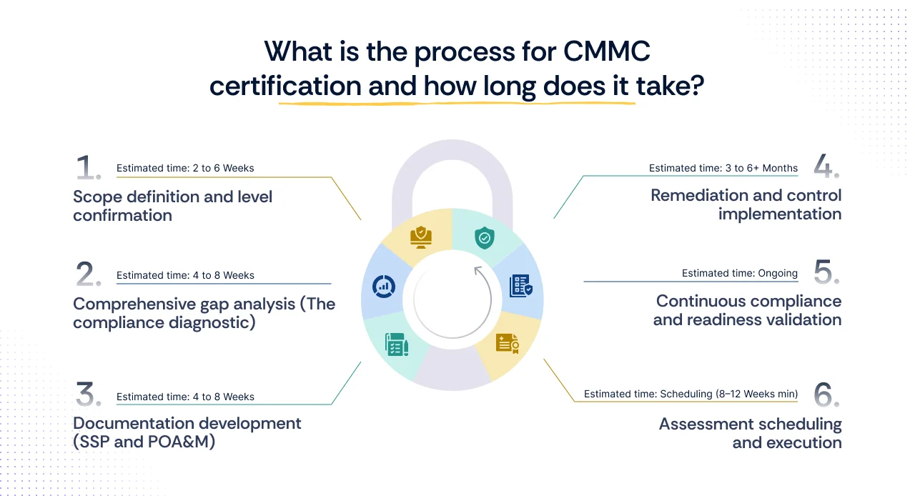 - Estimated time: 4 to 8 Weeks. This period involves rigorous evidence collection, control mapping (against NIST SP 800-171's 110 controls), and detailed reporting of deficiencies.