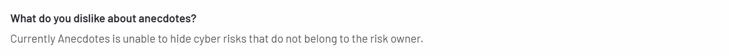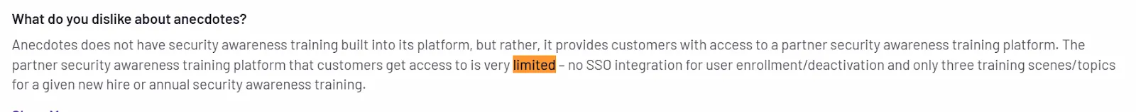 Anecdotes relies on a third-party platform for security awareness training, which offers limited Single Sign-on (SSO) integration and a narrow selection of training topics. For organizations requiring a more comprehensive, integrated training solution, this limitation is a significant drawback and can hinder the development of a robust, organization-wide compliance culture.