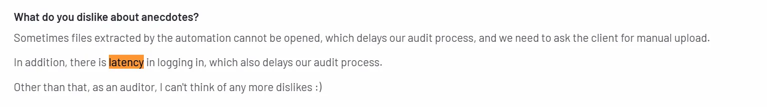 Anecdotes users frequently encounter automation issues, such as files failing to open, which disrupts audit workflows and necessitates manual intervention. Additionally, delays caused by login latency further hinder the platform’s efficiency, particularly for time-sensitive compliance tasks. These performance delays undermine the platform’s overall reliability.