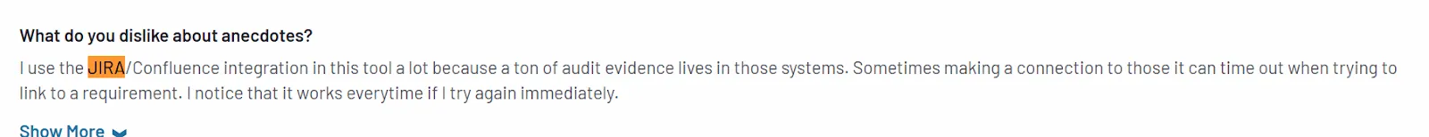 Users have reported difficulties integrating Anecdotes with critical systems. Common problems include timeouts and integration issues with JIRA/Confluence. Users also have experienced occasional file extraction failures, forcing manual uploads. These connectivity hurdles can disrupt the smooth flow of automated evidence collection and complicate audit preparation.