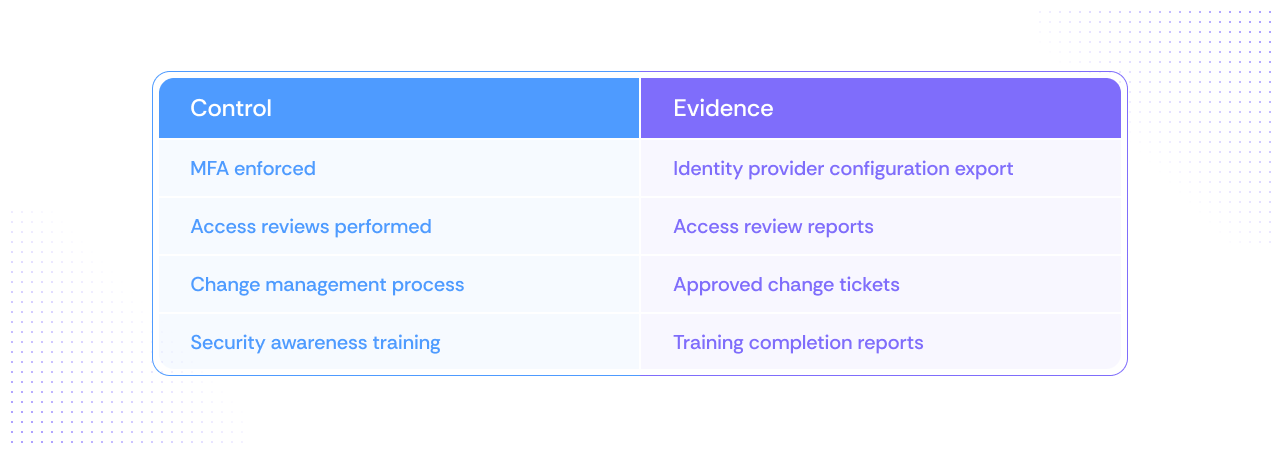 In practice, audit documentation connects controls to the evidence that proves they worked. For many teams, this often includes records such as access review exports, change approvals, configuration checks, and policy approvals.