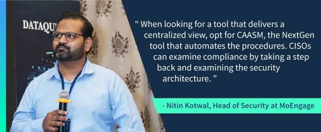 This statement was further supported by Nitin Kotwal, Head of Security, MoEngage, and Pratyush Kukreja, Business Head—APAC, Scrut Automation, titled: Simplifying your Compliance Journey with CAASM during their fireside chat. Nitin pointed out that the first step towards mapping is to analyze the method or tool you use for it.