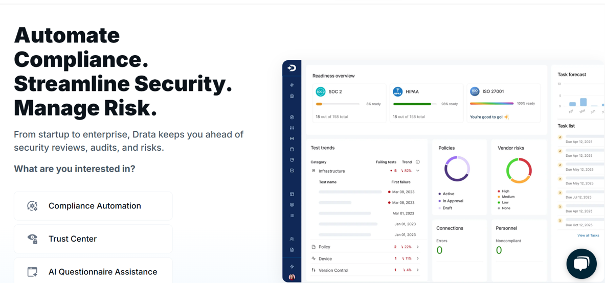 Drata is a robust security and compliance automation tool offering solutions for continuous control monitoring, automated evidence collection, and workflow optimization. It helps organizations streamline and maintain compliance across various frameworks, ensuring continuous audit readiness.