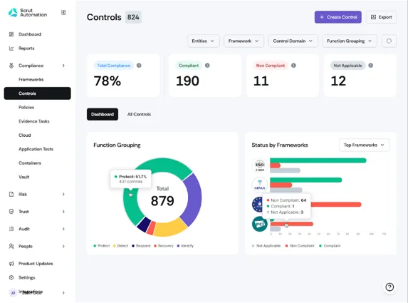 - Control dashboard: It enables organizations to monitor and manage controls across multiple frameworks and visualize distribution across key functions for prioritization.