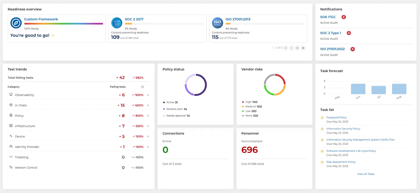 Drata’s compliance dashboard combines the essential trends, tasks, and alerts required to give a holistic view of organization's risk and compliance posture.