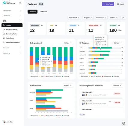 - Policy dashboard: The policy dashboard simplifies policy management by providing a clear view of policy statuses, departmental prioritization, and upcoming reviews. It lets you visualize the total number of policies across each stage of the creation to publishing lifecycle.
