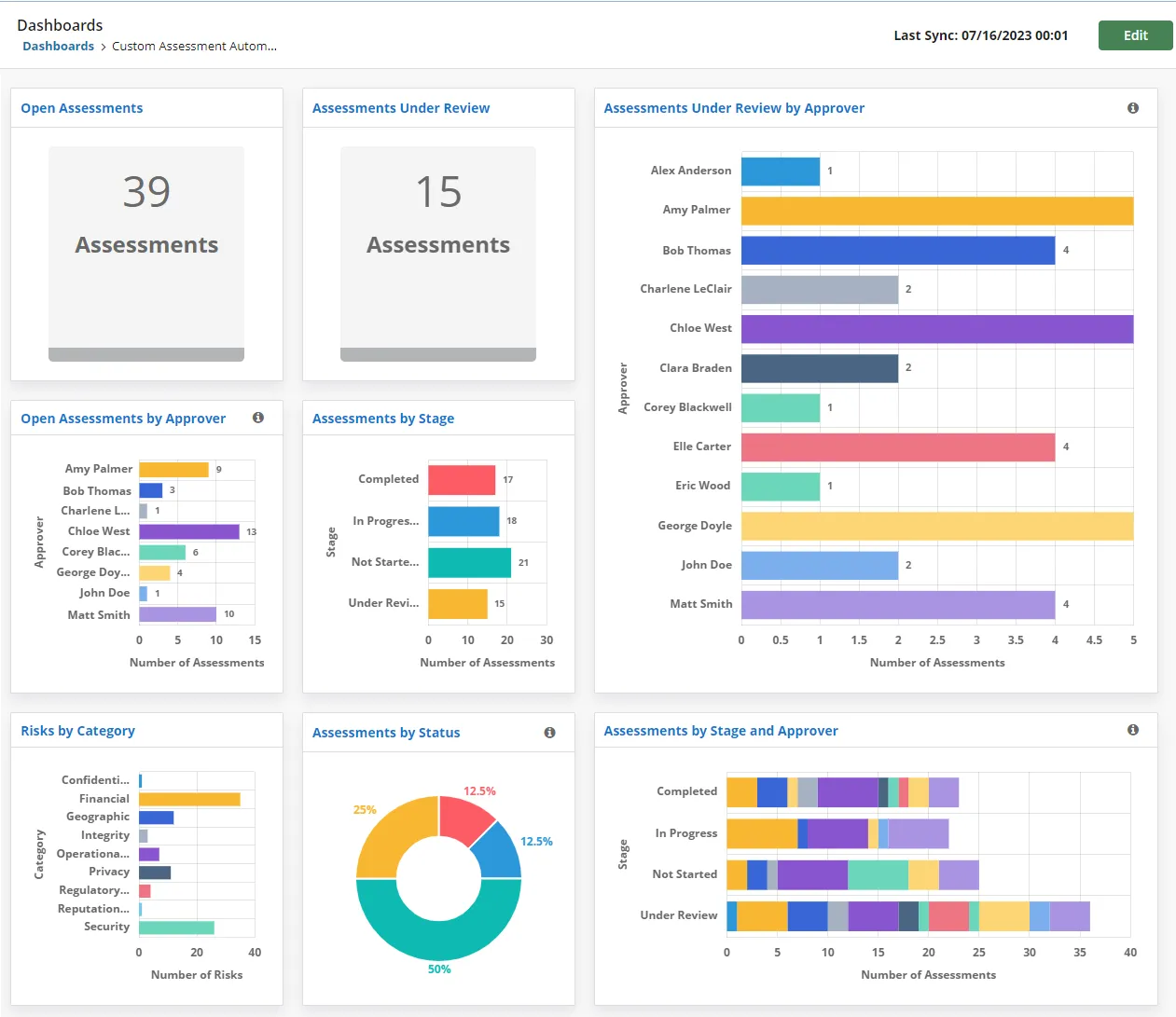 - Custom dashboards: Organizations can build custom dashboards that provide visual summaries of assessments, processing activities, assets, and vendors. They can craft custom widgets and assemble them in a dashboard to highlight criteria most relevant to their organization's day-to-day operations and business needs. Users can examine data segments within a widget to see a list of included records.