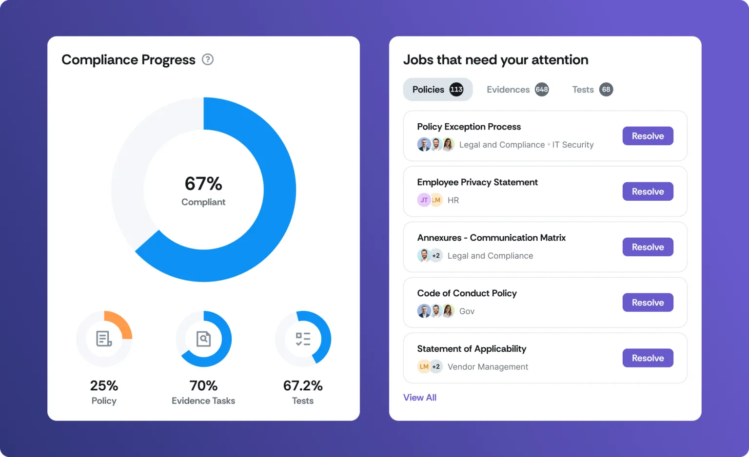 - Compliance dashboard: This provides a high-level overview of an organization’s compliance status with a consolidated representation of the percentage of compliant controls. It enables organizations to track risks, vendors, audits, and frameworks at a glance.