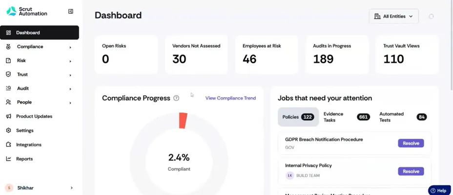 Scrut’s dashboards provide a consolidated view of compliance progress, risks, vendors, audits, and frameworks.