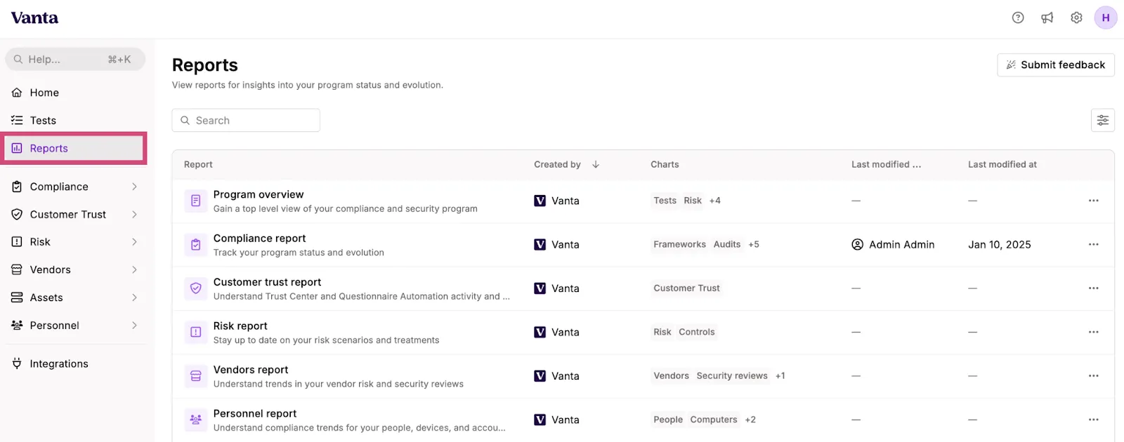 Vanta offers advanced reporting features, including comprehensive dashboards and detailed reports with relevant, insightful metrics. Vanta users can view all available reports from a centralized reports page.