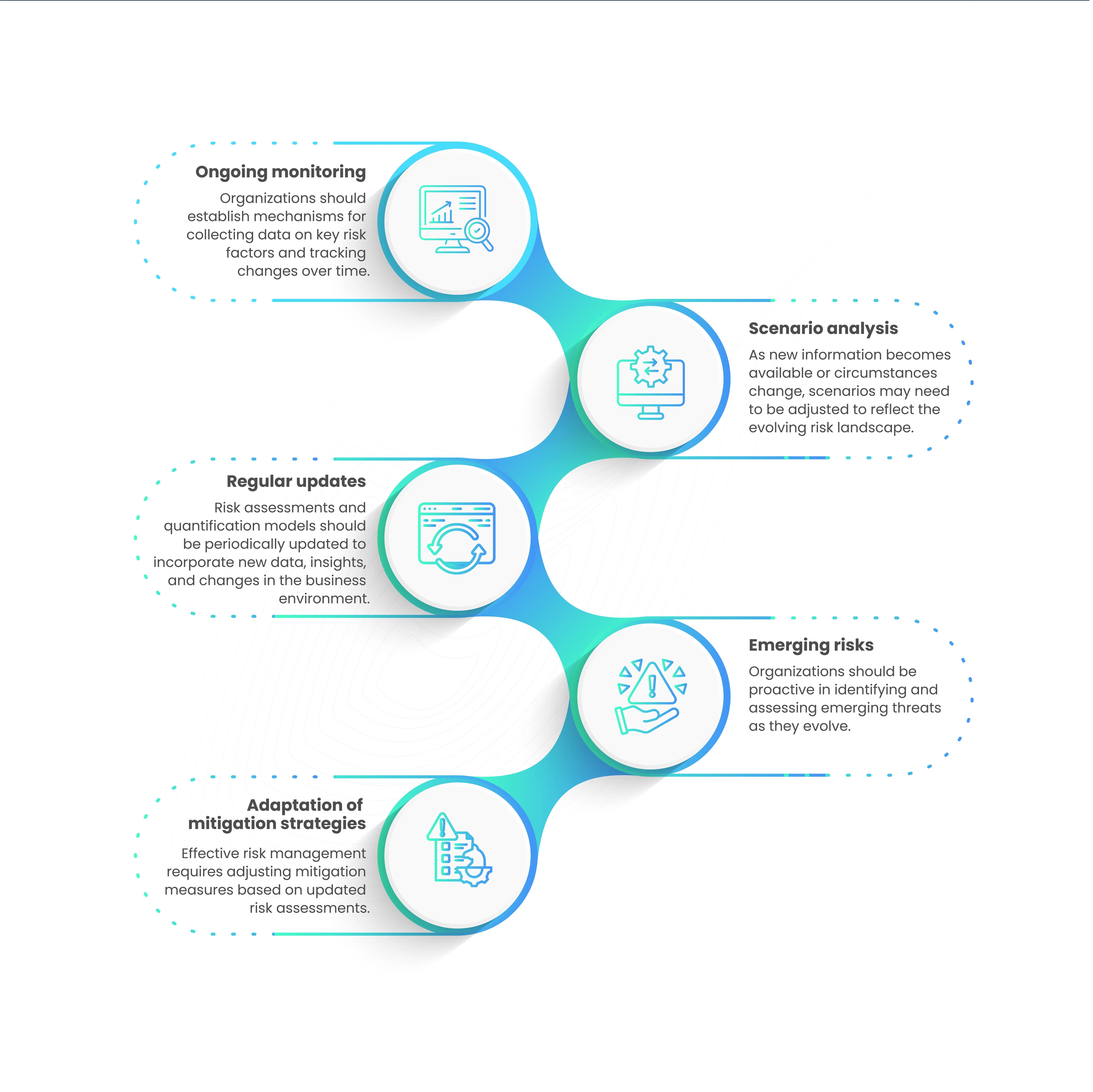 Risk quantification is not a static process, and it must evolve to adapt to changing threats and vulnerabilities. In the following image, we depict some key mechanisms organizations can deploy as a part of risk quantification to keep up with evolving threats.