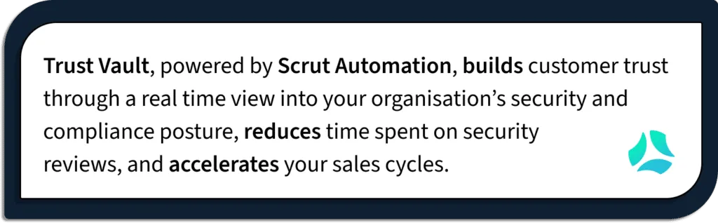 Scrut’s trust vault module allows you to stay one step ahead of the competition by building customer trust from day one. You can close enterprise deals faster by gaining potential customers’ trust and demonstrating a solid security posture with customized and easy-to-build auto-populated security pages.
