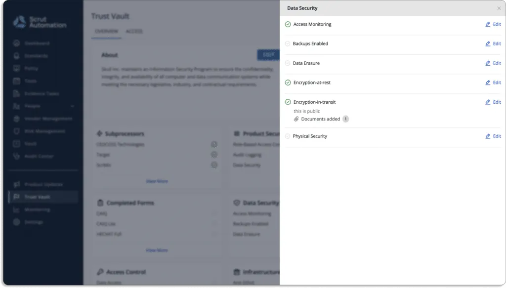 You can demonstrate real-time compliance transparency to your clients by using the auto-populated Trust Vault page, which is updated to show the most recent updates across controls, compliances, and sub-processors.