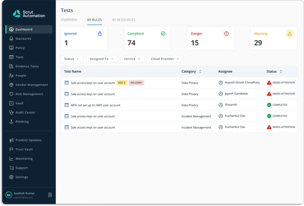 - Fix cloud misconfigurations: Scrut’s cloud security module ensures that your cloud infrastructure is always compliant. The platform sends alerts with specific instructions for correcting any misconfigurations.