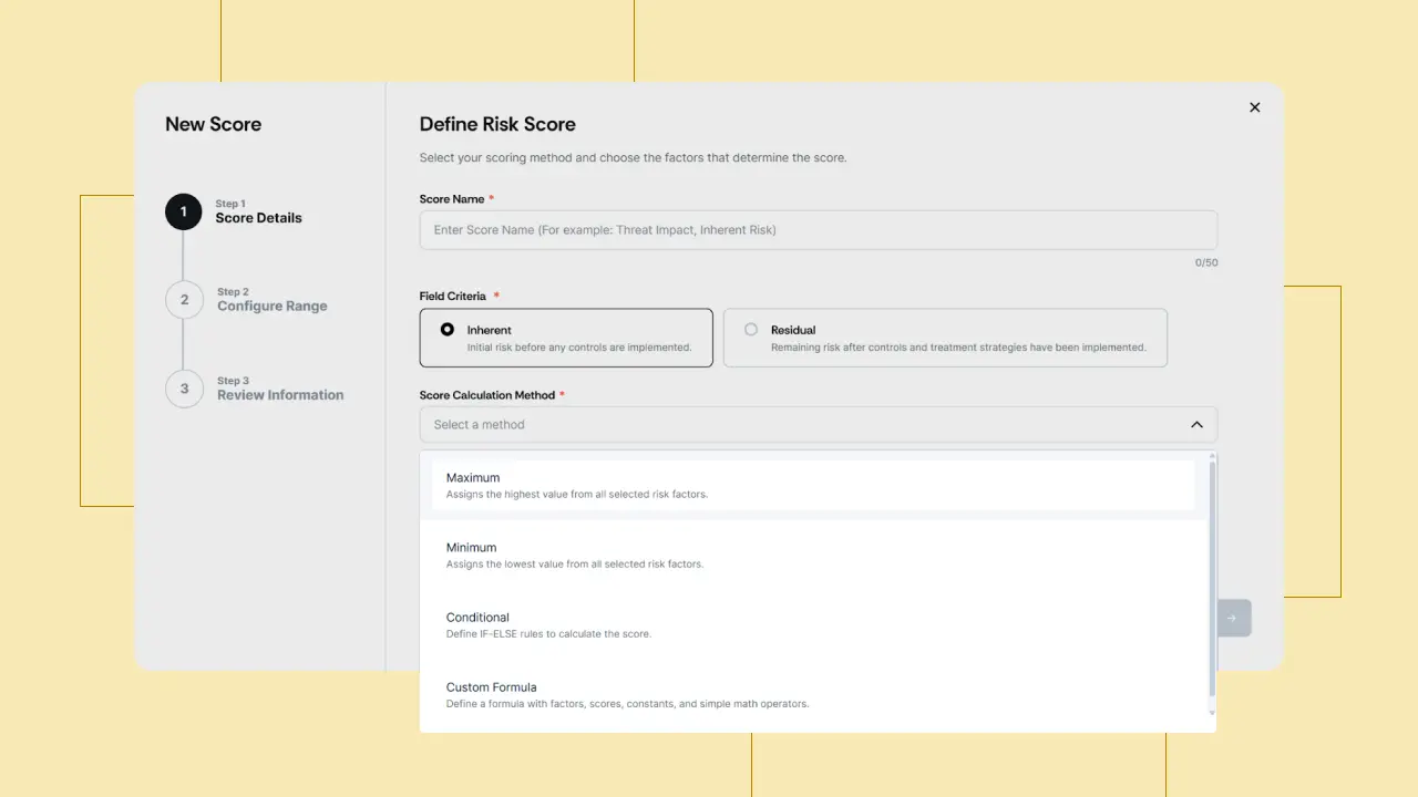 Instead of forcing every risk into a single, pre-built scoring method, you can now pick from three flexible scoring methods upfront when configuring a new risk score: