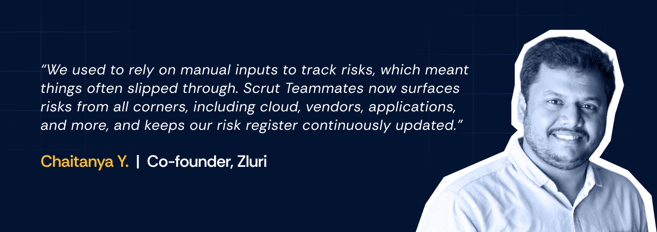 Scrut Teammates brings AI-assisted execution directly into risk workflows. Instead of relying on manual inputs or scattered signals, the platform continuously surfaces risks across cloud infrastructure, vendors, applications, and other systems. Teams can investigate issues faster, assign remediation, and keep the risk register up to date without relying on spreadsheets or periodic reviews.