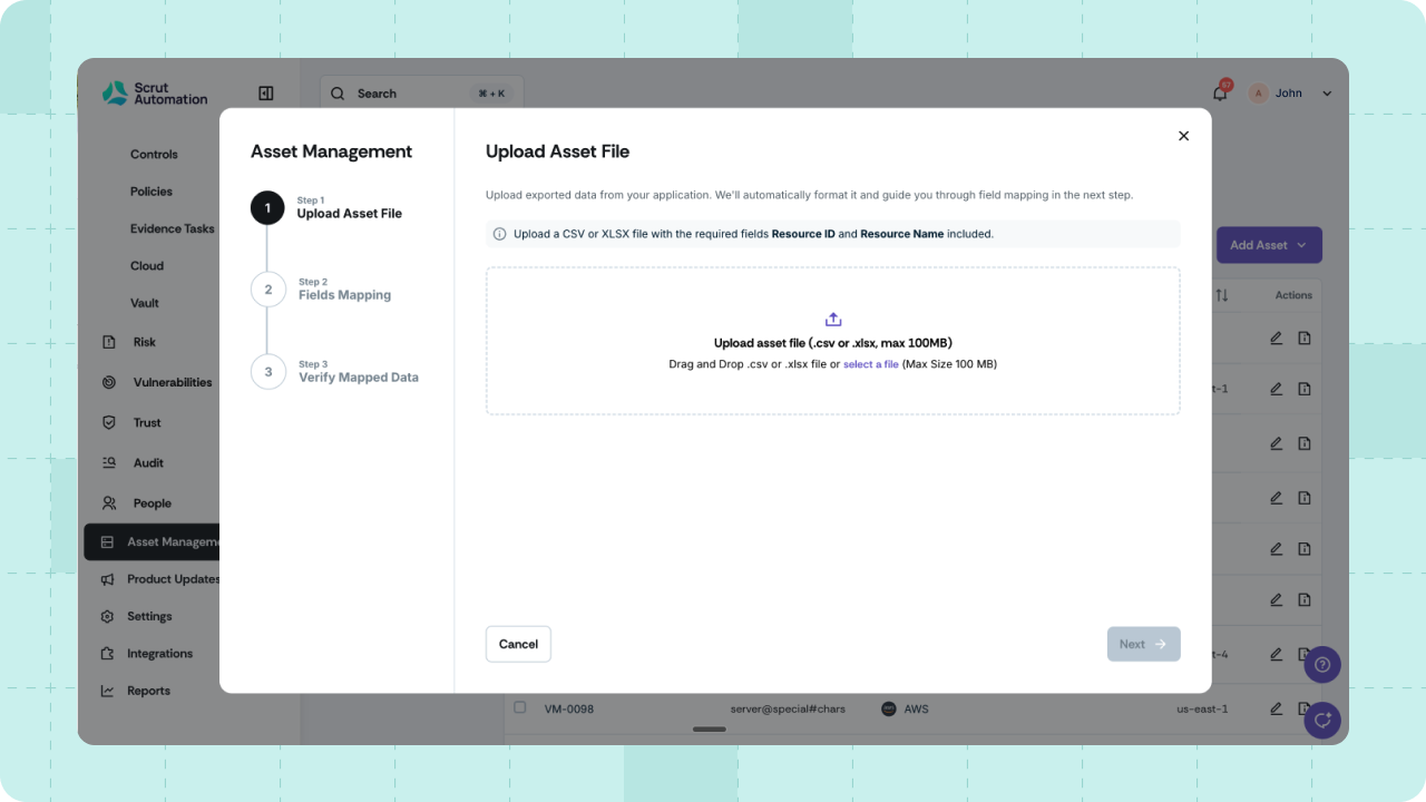 - Map fields using a guided wizard: Easily map your existing column names to Scrut fields, even if they do not match.
