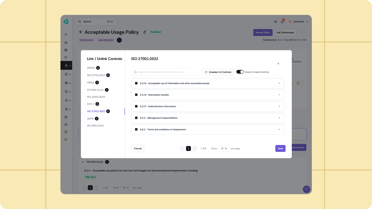 Map uploaded policies to the right controls automatically: Scrut Teammates analyzes your policy documents and suggests policy - control mappings for both standard Scrut controls and custom controls. You can accept, reject, or adjust suggestions before saving.