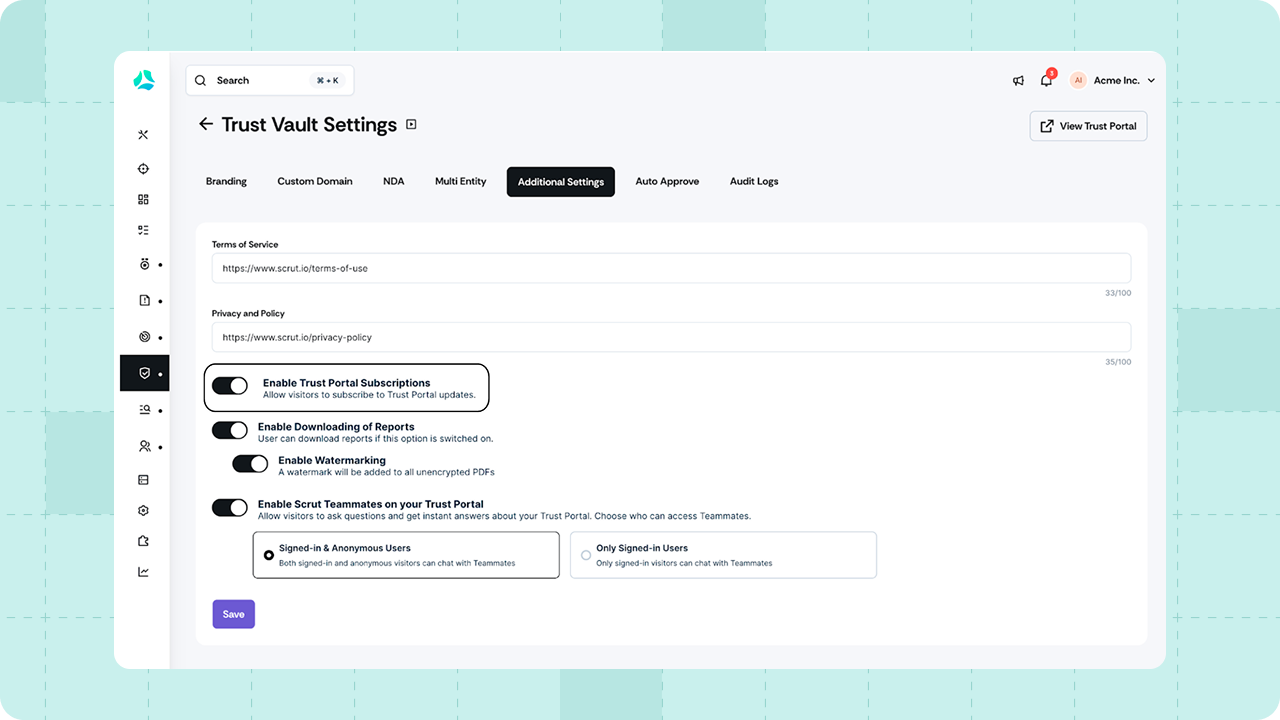 - Trust Portal Subscriptions: Your customers can now subscribe and receive instant notifications whenever your Trust Portal updates are published.