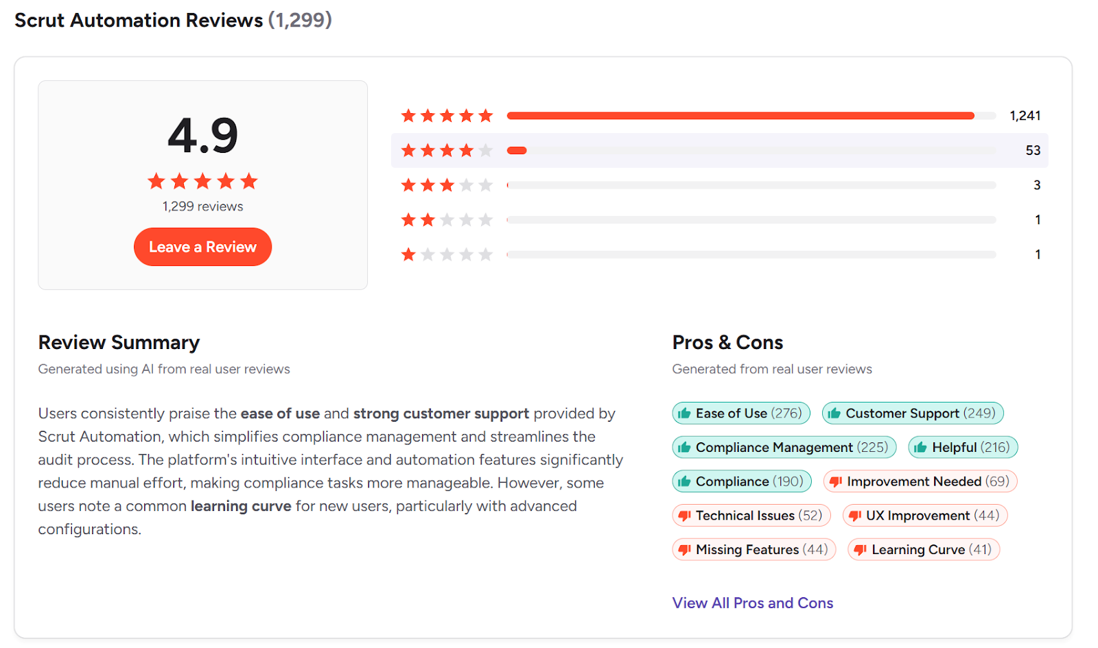 Scrut supports 50+ frameworks with 90+ customizable policy templates, 1,400+ unified controls, automated evidence collection, continuous CIS Benchmark monitoring, and a dedicated vendor risk management portal. Based on our implementation experience across 2,500+ customers, the platform’s strength surfaces most clearly during multi-framework rollouts where shared controls eliminate redundant work. Currently it is standing at a 4.95/5 rated as the best GRC platform or use the ease of use.