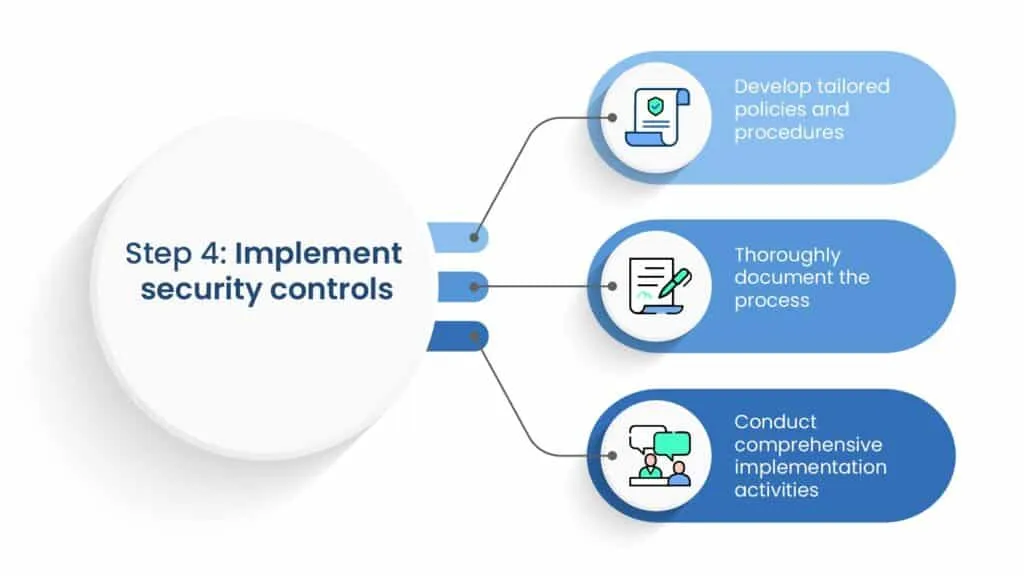 Implementing security controls involves the practical deployment and integration of these measures within the organization’s information system and operational environment. This process ensures that the selected controls are effectively applied to mitigate security risks and protect sensitive assets.
