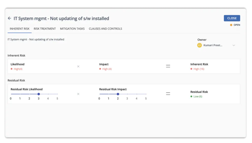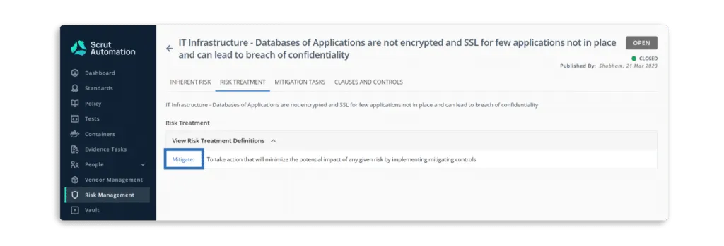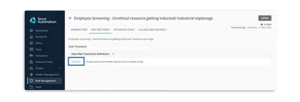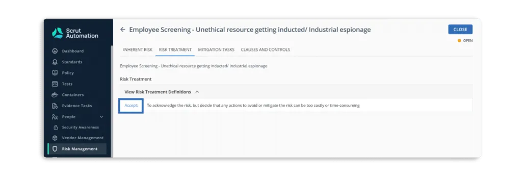 Scrut Risk Management provides a centralized interface for identifying, assessing, and mitigating IT and cyber risk. It gives organizations the awareness they need to avoid risks and communicates the risk implications on high-priority strategic targets. With built-in scoring techniques, expert-provided inherent risk scores, and automated workflows, it’s quick and easy to establish new IT risk programs to better avoid, control, and mitigate risk. Click here for more details on how Scrut helps in risk treatment.