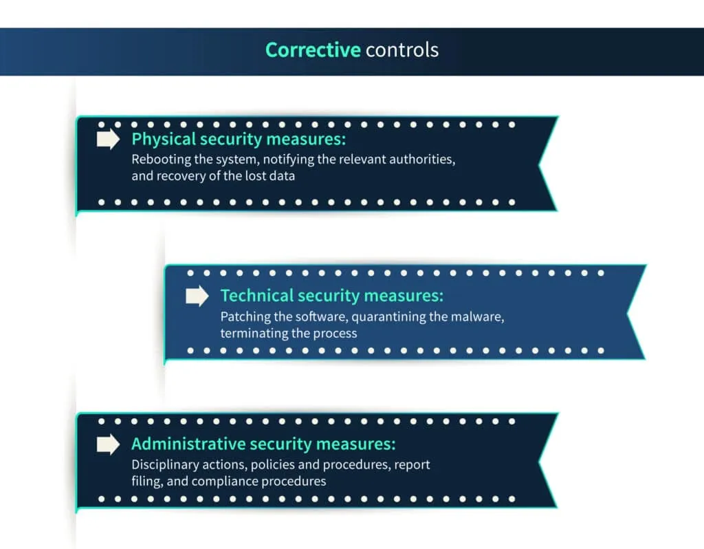 Despite sufficient preventive measures, your organization might fall victim to a cybersecurity incident. The internal controls for taking corrective actions are designed to measure and minimize the effects of the security incident and minimize business downtime after the incident. The corrective measures are taken after the detective measure discovers the issues. After the incident, the preventive and detective measures are reconsidered, and changes are made as required to prevent another attack.