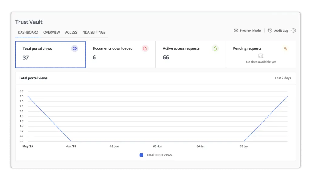 The Trust Vault lets users publicly and transparently demonstrate their security and compliance posture. Users can create a security page on their website that is tailored to the company’s identity. It automates demands for security and compliance practices through the public display of information security-related certifications, reports, and attestations, as well as gated NDA-backed access to in-depth reports. Furthermore, it helps to demonstrate your daily compliance management and security actions to internal and external stakeholders.